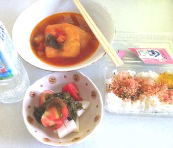防災訓練で配られたご飯+おうちでおかずやスープものをプラスしました。