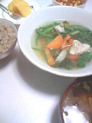 白湯風鍋?お野菜が摂れ、鶏肉コラーゲンたっぷり。超見切れてますが、トマト+お野菜+お豆の小鉢で