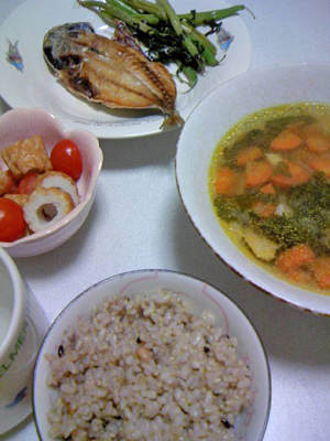 野菜入りカレースープと、玄米+雑穀と、お魚と